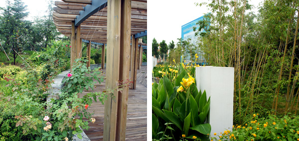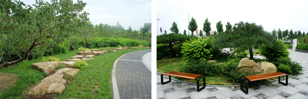 每個(gè)景觀節(jié)點(diǎn)上,植物的配置方法都是不一樣的,如在下沉廣場,主要是以小龍柏、金葉女貞等小灌木片植成方形或弧形,間或點(diǎn)綴石楠、梅樹,看起來規(guī)整、簡潔;而在設(shè)計(jì)風(fēng)格為江南園林的南廣場上,是將貴重的造型油松單植,通過不同的組合,形成三個(gè)風(fēng)格相近的綠島,周邊種植美人蕉、玉簪、竹子,并砌起白墻,上面開圓形拱門或圓窗,散發(fā)出詩意江南的靜謐和婉約氣息。"游憩步道是貫穿整個(gè)景觀的軸線,為了形成曲徑通幽的景觀效果,我們將對(duì)植、孤植、叢植都多種方法結(jié)合運(yùn)用,特別是在三叉路口,多種植海棠、櫻花、杏花等,一方面,花開的時(shí)候,綠葉間繁花點(diǎn)點(diǎn),會(huì)吸引人們不斷向前探尋更多的美景;而花落之后,茂密的枝葉又形成隱隱約約的視覺感受,前方轉(zhuǎn)過彎后風(fēng)景什么樣,又讓人很想去看看。"高經(jīng)理笑著說。