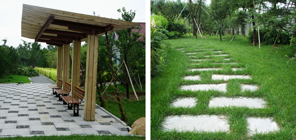 而在道路十字路口的節(jié)點(diǎn)處,則主要是用10cm×10cm的小花崗巖鋪地,鋪出來的路面整潔、平坦,看似簡單,實(shí)則對(duì)施工技術(shù)要求相當(dāng)高。草坪中的地面鋪裝,則采用花崗巖汀步,用錯(cuò)縫鋪裝法,兩塊花崗巖之間用草皮鑲嵌,就像給每塊花崗巖鑲了一道綠邊,與旁邊的草坪和諧地融為一體。貫穿整個(gè)工程的游憩步道,全部采用"人字形"的鋪裝方法,中間用透水磚、兩邊以花崗巖鑲邊,透水磚價(jià)格不高,用以鑲邊的花崗巖是利用了鋪裝中剩余的邊料,雖然用料簡單,但通過對(duì)技術(shù)的嚴(yán)格要求,鋪出的路面卻整潔而不失韻味,是一種實(shí)用、環(huán)保、節(jié)約的做法。