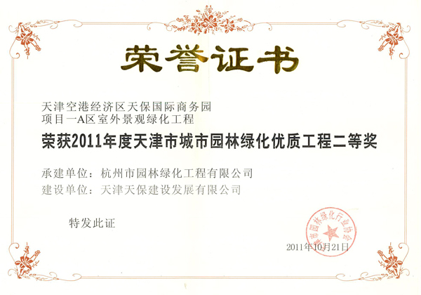 近日,由天津市園林綠化行業協會評選的“2011年度城市園林綠化優質工程”獲獎項目正式公布,其中,由杭州市園林綠化工程有限公司負責施工的“天津空港經濟區天保國際商務園項目—A區室外景觀綠化工程”榮獲“2011年度天津市城市園林綠化優質工程二等獎”。