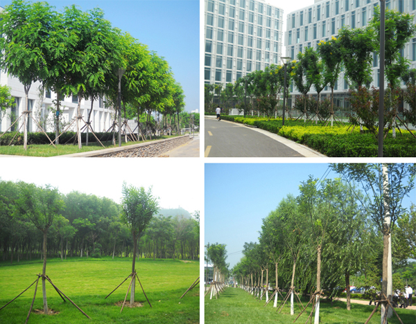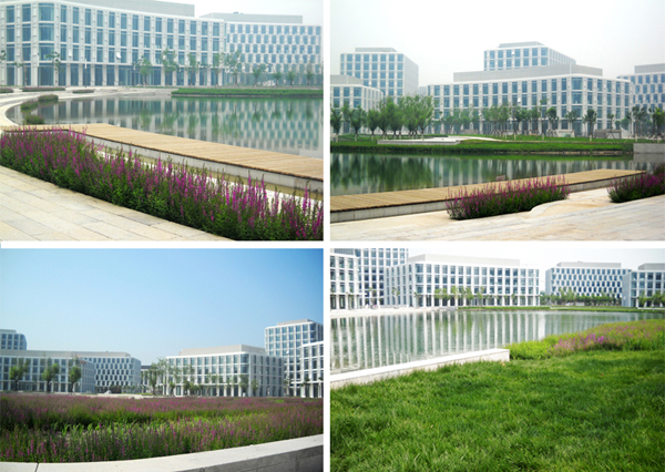 本工程是大型商務園配套景觀綠化工程,整個項目以人工湖為中心將建筑呈環形布置,分為內環、中環、外環。綠化圍繞建筑均勻有層次的分布,環路兩側栽植國槐;辦公樓之間則種植日本晚櫻、碧桃、海棠等觀花、觀葉類喬木,以及黃楊、女貞等灌木和綠籬;中心湖區域兩側的能源半島和濕地半島上被喜水性植物覆蓋,起到凈化湖水的作用,岸邊種植垂柳,開辟休閑區域;園路鋪裝材料選用水洗石、花崗巖,石汀、鋪裝與綠地自然銜接;再加上花壇和景觀小品,各種觀賞性植物互相襯托,喬木與灌木合理搭配,使得景觀與建筑、環境完美結合。