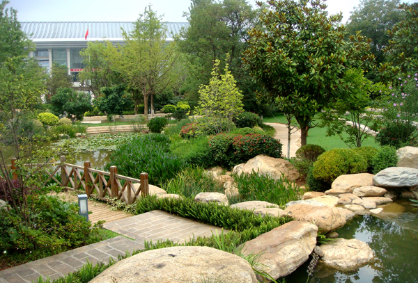 自然式駁岸讓人工湖更具野趣,大小不一的天然景石成組擺放。從岸邊到水中,陸地植物、濕地植物、水生植物依次“排列”,以最淳樸的方式演繹著自然規(guī)律。水邊大量栽種柳樹,輕柔的枝條隨風搖擺,旁邊搭配清香木、雞爪槭等耐水濕喬、灌木,豐富的葉色、優(yōu)美的姿態(tài)將普通的湖岸裝飾一新。對于湖面較大的部分,僅在湖體四周以塊狀方式種植水生植物或濕生植物,中央?yún)^(qū)域則不種植水生植物,以擴大空間感,使得樹木、建筑物能夠形成完整的倒影,成就優(yōu)美的“水中畫”。