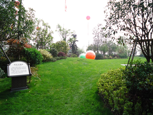 更引人注目的,還有銷售展示中心前面的雕塑噴泉,該噴泉運用花崗巖整石雕刻拼接而成,工藝極其復雜,自上而下不斷灑落的水花,營造出一片清涼;無以復加的鏤空鐵藝圓頂繁復花紋和拱門的石材立面裝飾的皇家景觀亭,精致中透露出大氣;潺潺溪流、霧氣繚繞的人工溪澗,如夢似幻;大面積的高爾夫果嶺草坪蜿蜒起伏,華貴雍容……