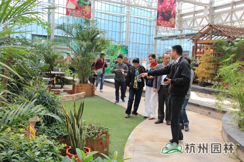 第二天,考察團(tuán)在杭州市園林綠化股份有限公司總裁張炎良、副總裁丁旭升的陪同下參觀了畫境·青山湖花園中心。該花園中心是一個(gè)集園藝產(chǎn)品研發(fā)、展示和推廣的現(xiàn)代園林高新技術(shù)平臺(tái),致力于打造庭院設(shè)計(jì)、咨詢、建造、養(yǎng)護(hù)等各類功能綜合的一站式園藝服務(wù)中心。項(xiàng)目有近3000畝配套生產(chǎn)基地,12000平米研發(fā)與生產(chǎn)溫室,以及室內(nèi)情景展示區(qū)、園藝展示區(qū),室外陳列展示區(qū)、應(yīng)用展示區(qū)等多個(gè)功能區(qū)塊。其中,用于室內(nèi)園藝展示的4000平方米的展覽溫室,引進(jìn)荷蘭PRINS溫室技術(shù),實(shí)現(xiàn)對(duì)溫度、光照等全智能控制,是一個(gè)技術(shù)含量極高的節(jié)能、環(huán)保型現(xiàn)代溫室。