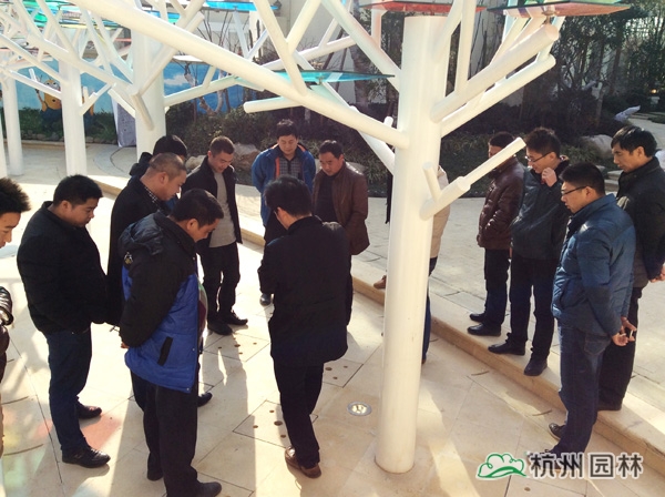 會議首先聽取了施工單位、監理單位關于該工程施工及質量情況的詳細總結與匯報。杭州市園林綠化股份有限公司項目負責人陳為有作為施工單位代表,就本項目的施工情況進行了介紹。隨后,參會人員一行來到工程現場,從硬質景觀鋪裝、植物種植、亮化燈具安裝質量等各方面進行檢查驗收。現場驗收結束后,各相關單位代表就發現的問題進行了總結和表態發言。