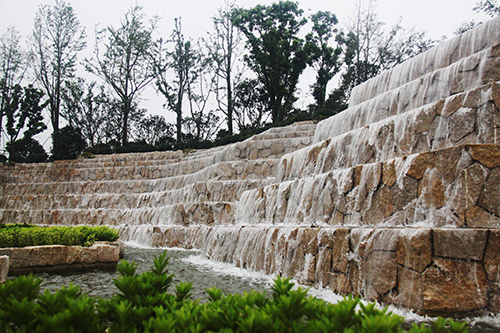 入口水景開闊大氣,行道樹陣整齊劃一。一場歌劇的序曲,不管是澎湃激昂,還是歡快活躍,抑或是柔情舒緩,都將對整個局情起著舉足輕重的作用。入口景觀的作用同樣如此,它是整個園林工程留給人們的第一印象。走進項目主入口,寬40米、高10米的寬闊水景,高達7級的層階落差,水流層層跌落間,水聲轟鳴,仿佛一道瀑布橫掛眼前。3000平方米的地面鋪裝,全部采用50毫米厚的深灰色和芝麻白花崗巖,走在上面,平坦、踏實。兩側的花壇,邊緣鋪設手法也呈臺階狀,蘑菇石貼面,花崗巖壓邊,與水景遙相呼應。花壇中的植物,上層選用香樟、銀杏、櫸樹,中層用櫻花、紅葉李,下層用麥冬、水蠟、花石榴及草花,再加上造型樹的點綴,營造出群島效果,使得整個入口景觀莊重典雅,大氣天成。