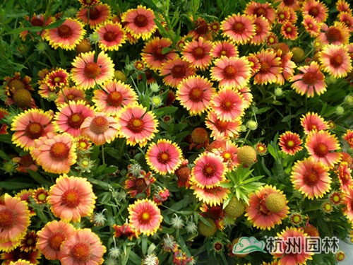 天人菊,原產北美,中國中、南部廣為栽培。耐干旱炎熱,不耐寒,喜陽光,也耐半陰,宜排水良好的疏松土壤。它耐風、抗潮、生性強韌,具耐旱特性。每月均需施全肥,不適合播種,最好小苗栽植,需2次摘心。