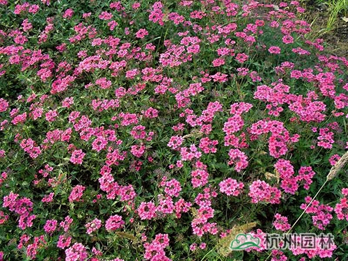 美女櫻,其姿態優美,花色豐富,色彩艷麗,盛開時如花海一樣,令人流連忘返。美人櫻株叢矮密,花繁色艷,開花部分呈傘房狀,花色有白、紅、藍、雪青、粉紅等,花期為5-11月。喜陽光、不耐陰,較耐寒、耐蔭差、不耐旱?;ㄆ诳蓢娏姿岫溻?,促進花開放。
