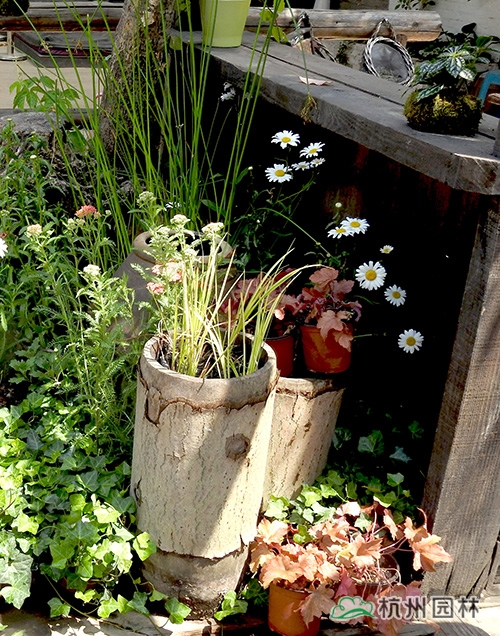 庭院一角,兩株大濱菊、三兩陶罐,一叢水蔥、幾株礬根、蓍草、金線蒲,形成簡(jiǎn)潔但不簡(jiǎn)單的景觀。