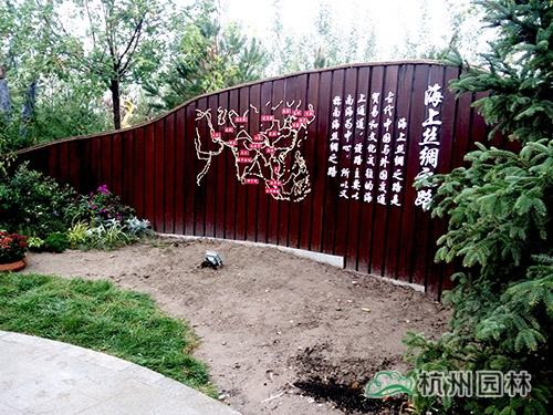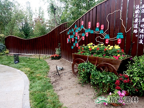 本處已有木制景墻做背景,花境施工前已在幾個節(jié)點放置了花車、木桶等,并栽植了一棵較高大的紅皮云杉,為花境營造創(chuàng)造了良好的條件。結(jié)合景墻上的文字、地圖,以“陸上絲綢之路”文字為分界點,營造“絲?路”、“絲?念”兩組花境。