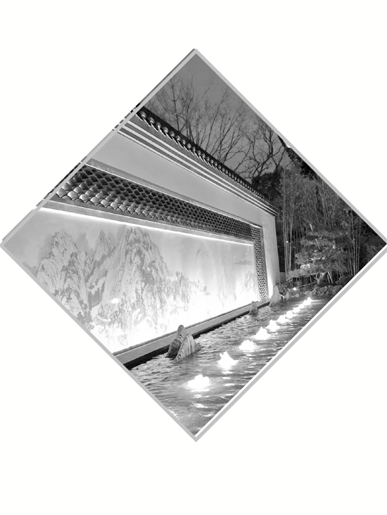 園區主入口,游人一進園,就能看到大瀑布和亭子,再加上富春山居圖造壁,呈現出浙江山水風景特點。浙江省地形復雜,其中三分之二的面積是山地丘陵,所以,浙江園也是依此而建的。為了能讓往來的游客在進園時就直觀的感受到這種景觀效果,盧山和團隊為游客們設計了兩條游覽線,一條從入口進來之后向山上走,體驗登高望遠,感受山林景觀的游覽過程;還有一條是從庭院路線走的,就是讓游客有行走在家宅的感覺。在設計時,盧山選取了明清時期的建筑形態,粉墻黛瓦。建筑上層是黑的,墻是白的,展現出浙江傳統建筑的文化元素。盧山還說:“眾所周知,浙江的茶葉非常有名,我們在展園里打造成了一個茶山景觀,再配上一些花卉。總體上,是要展示出一個富美浙江主題的庭院。”