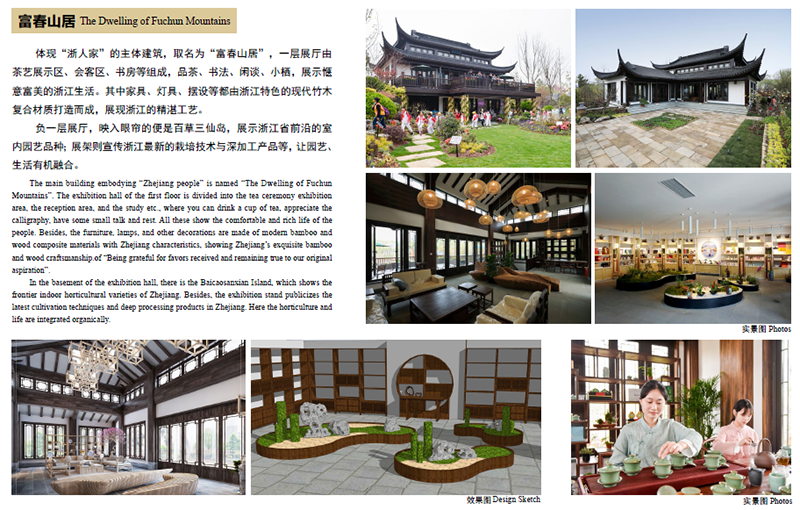 浙江園內體現“浙人家”的主體建筑取名為“富春山居”,該建筑以浙派民居為原型,飛檐翹角,格局大氣,盡顯浙江風情。深化這個建筑單體,團隊做了很多功課,花了許多心思,考察了許多浙江特色民居,在充分運用現代建筑材料與結構的基礎上,通過對浙江傳統民居建筑的經典片段提取和抽象提煉,賦予這些元素和符號以新的意義,構建出浙江傳統民居的新風貌。它不是對傳統民居建筑的照抄照搬,而是繼承和創新,設計了一棟獨一無二的建筑。