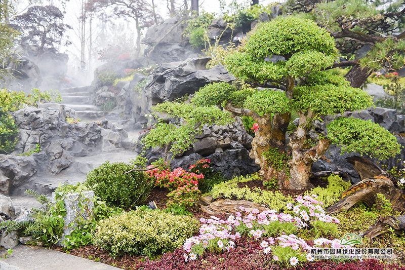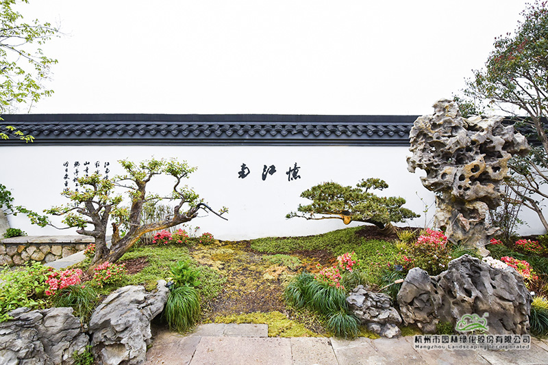 再往里走,富春山居照壁前的造型黑松和紅花檵木,一左一右,遙相呼應,樹姿優美,枝干舒展,仿佛熱情歡迎遠道而來的客人。這兩棵樹,是深化設計團隊跑遍全國重要苗圃挑選回來的,讓最美的一面呈現在游客面前。