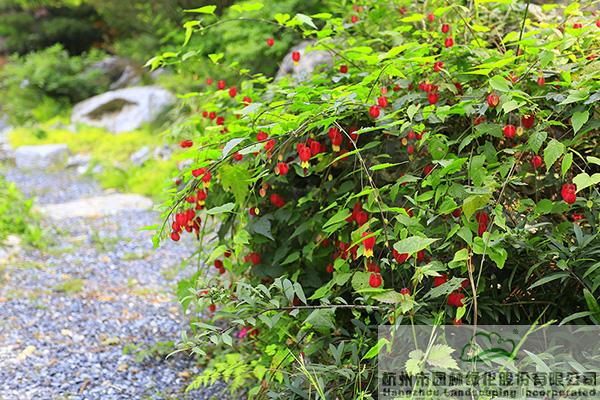 紅萼苘麻的花朵就像一個個紅燈籠,使原本沉悶的石頭充滿了自然的野趣。