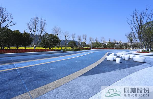 從各個廣場到沿溪綠道,全部采用透水混凝土材料,并在兼顧排水功能的同時,通過色彩、圖案的變化,營造移步換景的濱水景觀。廣場鋪裝主要選用深灰、淺灰、土黃等色彩的透水混凝土材料,根據現場景觀配色需求,設計不同的鋪裝組合,營造大氣自然、豐富多變的廣場景觀。靈溪公園入口處的波紋廣場,則以藍色透水混凝土材料為主,搭配亮麗的黃色,營造出流暢自然、色彩明亮的波紋效果,充滿了流動的旋律,再加上極富特色的異形樹池、坐凳,整個廣場又呈現出時尚的現代風情,帶給人們更加豐富的濱水景觀體驗。