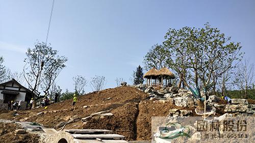 自今年四月份開工以來,杭州園的各項工作進展有序。截止目前,主體建筑、水系跌瀑、溪流假山等基本完工,大部分鋪裝已經完成,展園景觀風貌初見雛形。接下來主要進行喬木和大灌木的種植工作。正值夏季高溫時節,為提高樹木的成活率,施工中多措并舉,提前將挑好的大樹進行修剪、斷根、噴灑營養液;采用通氣透水的材料包裹土球,進行容器假植;制定精細澆水養護方案等,使植物清涼度夏,早日綻放風華。