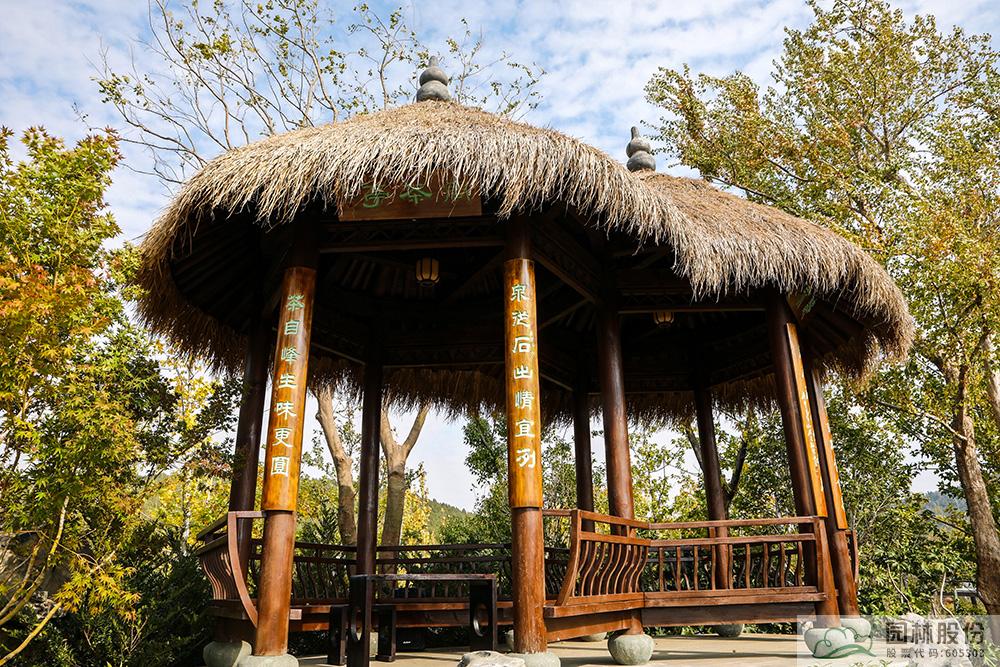 契合展區主題的樾香亭臨湖而立,雙坡屋面,八柱敞亭,柱子上書五言聯“魚樂人亦樂,泉清心共清”,盡顯悠閑舒適的情趣。在亭內憑欄而坐,側耳聽風雨,迎風嗅花香。抬頭遠望,荷葉亭亭的水面上,有魚兒在水中嬉戲;曲折的長橋上,游人在漫步觀景;水岸邊,銀杏、三角楓、烏桕等色彩繽紛,編織出一幅深秋的美麗畫卷。