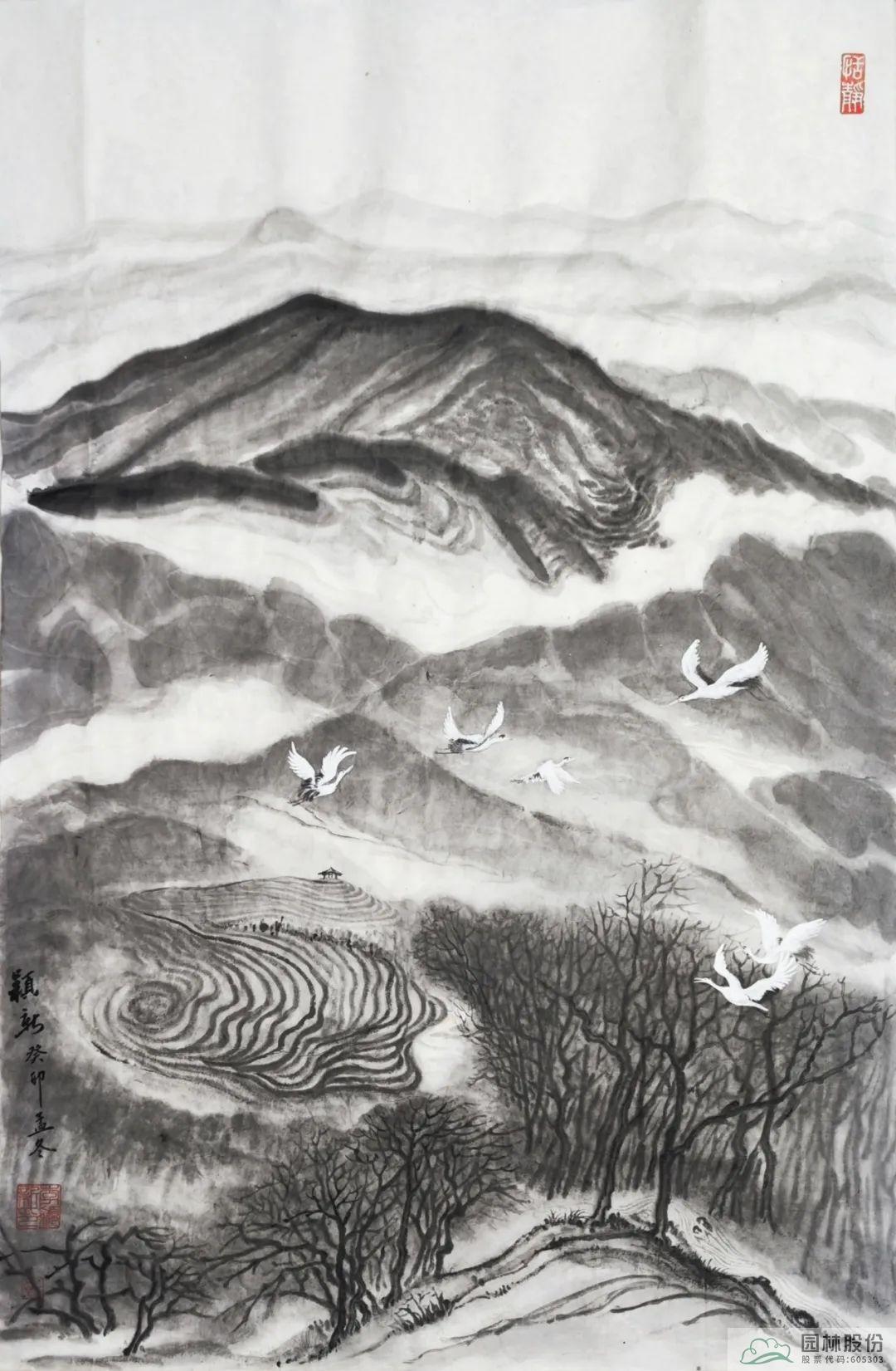 其中,杭州市園林綠化股份有限公司辦公室主任李穎新以徑山美景為創(chuàng)作內(nèi)容的書畫作品成功入選前20名。作品以杭州徑山及國家級(jí)美麗休閑鄉(xiāng)村-小古城村的自然景觀、鄉(xiāng)村風(fēng)情、茶園風(fēng)貌、翩翩白鷺等作為創(chuàng)作素材,主要表達(dá)在新時(shí)代背景下,隨著鄉(xiāng)村振興戰(zhàn)略的全面推進(jìn),一幅幅人與自然和諧共生的美麗畫卷正在神州大地徐徐展現(xiàn)。圖中山巒起伏、云霧氤氳、茶園連綿、溪水潺潺、白鷺紛飛……共同繪就一幅意境唯美的鄉(xiāng)村風(fēng)情畫卷,留下一段令人念念不忘的鄉(xiāng)愁記憶。