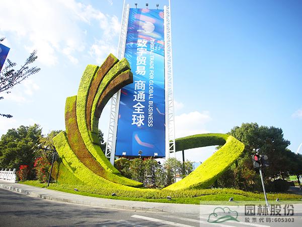 為增加數(shù)貿(mào)展會主題在邊側帶內設置3座綠雕:杭扇-以扇子造型主題的全球數(shù)字貿(mào)易博覽會綠雕,展-以全球數(shù)字貿(mào)易博覽會會徽造型綠雕,數(shù)貿(mào)-以飄帶造型主題的“數(shù)貿(mào)錢潮 杭向未來”綠雕。綠雕植物均采用佛甲草和五色草搭配,周邊采用三角梅及花鏡植物配置。港南大道島頭花鏡運用金姬錐、彩葉球、細葉芒、塞娜等植物來強化迎賓氣氛,通過多年生地被草花,結合精致植物組團+特色綠雕,共同營造多彩氛圍,打造熱烈迎賓門戶。